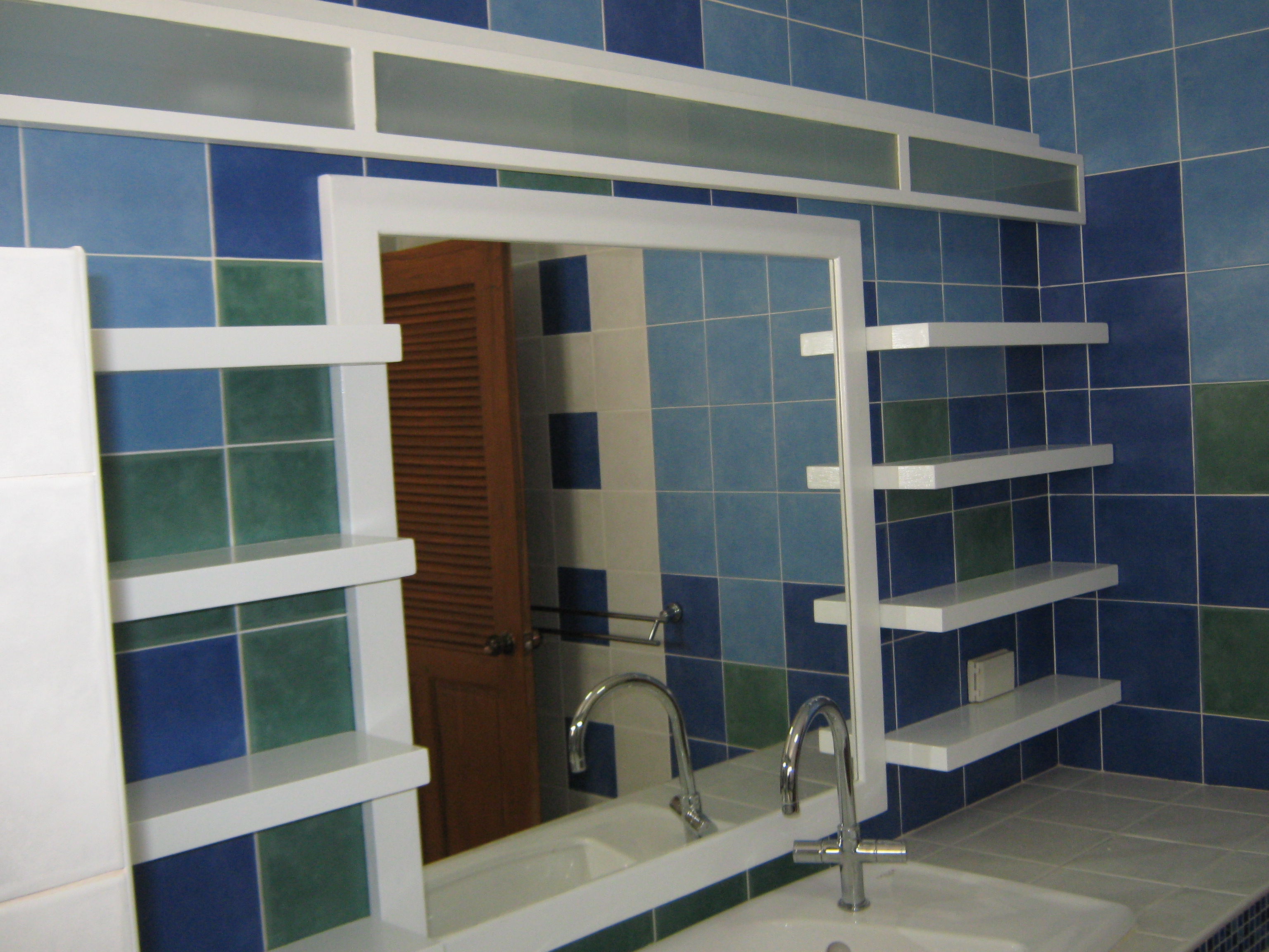 หิ้งติดผนังลายวินเทจ สีครีมอุตสาหกรรม มีตัวแขวนของอยู่ด้านล่าง พร้อมหิ้งติดลูกติ่งเล็กๆ ลายน่ารัก ด้านบนหิ้งเพ้นท์ลายดอกไม้หลากสี