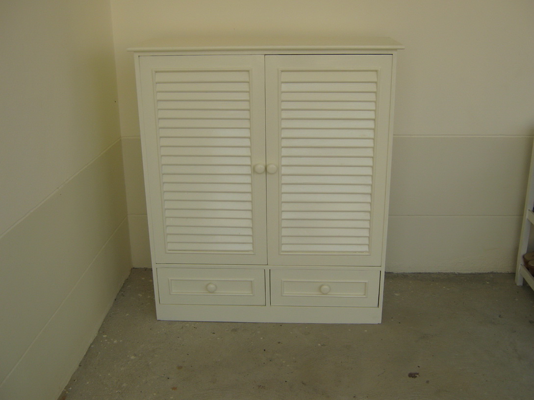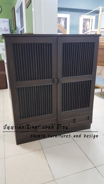 ตู้รองเท้าขนาดกะทัดรัด ขนาด 1.00 x 0.45 x 0.55 เมตร ทาสีโอ๊คแดงด้าน บานประตูซี่กลึงกลมแนวตั้ง ด้านในบานติดตาข่ายกันแมลง ด้านในมีชั้น 1 ชั้น 2 ช่องสำหรับเก็บรองเท้าประมาณ 8-10 คู่ ด้านบนตู้มีไม้กั้นกันตกไว้ 3 ด้าน เพื่อที่จะตัดเบาะขนาด 3 นิ้วมาใส่