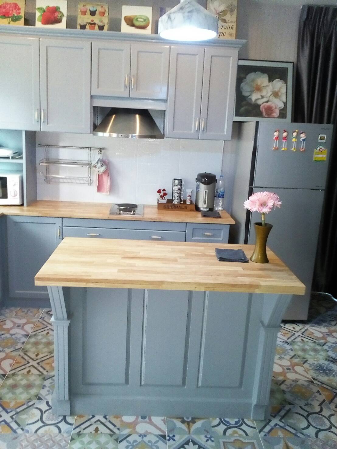 งานบิ้วอินติดตั้งชุดห้องครัว โทนสีเทาอุตสาหกรรม รูปทรงตู้เค้าเตอร์เป็นรูปตัวแอล ฝั่งซ้ายมือมีซิ้งค์ล้างจาน 1 หลุม ฝั่งปีกขวาเป็นเตาไฟฟ้าประเภทฝังบนท็อปตู้ ท็อปตู้เค้าเตอร์เป็นไม้ยางพาราหนา 4 เซ็นติเมตรทาสีธรรมชาติไม้เคลือบแลคเกอร์ด้าน อีกทั้งติดตั้งตู้แขวนผนังครอบเครืองดูดควันพร้อมทั้งแบ่งโซนตู้ด้านซ้ายมือเป็นที่จัดวางเตาอบไมโครเวฟและอุปกรณ์ไฟฟ้า อีกทั้งชุดห้องครัวนี้มีเค้าเตอร์ ISLAND แบ่งพื้นที่สำหรับนั่งรับประทานอาหารได้ และเป็นตู้เก็บของเอนกประสงค์อีกฝั่งขอตู้ไอร์แลนด์ในห้องครัวได้ด้วยค่ะ