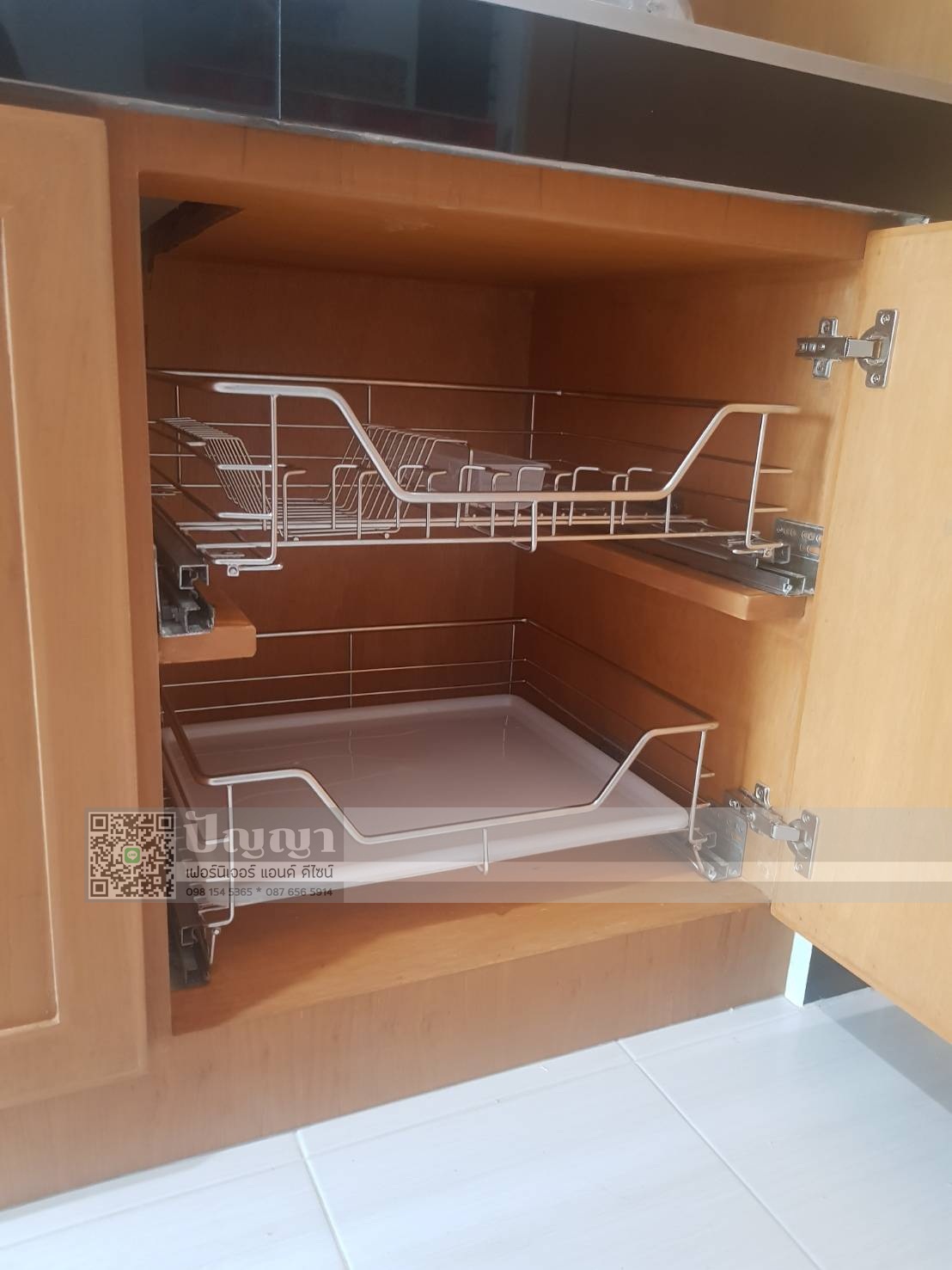 งานติดตั้งประตูวงกบบานทึบ และตู้ลิ้นชัก 3 ลิ้นชักใต้เค้าเตอร์ปูน พร้อมติดตั้งอุปกรณ์แสตนเลสสำเร็จรูป ตัวตู้พ่นสีย้อมไม้สักเคลือบแลคเกอร์ด้าน และตู้เก็บของเอนกประสงค์ ข้างเค้าเตอร์ปูน ตั้งชิดติดเพดาน 4 บานประตูเล็ก/ใหญ่ ด้านในมีชั้นเก็บของทั้งเครื่องครัวและอุปกรณ์ทำความสะอาดบ้าน